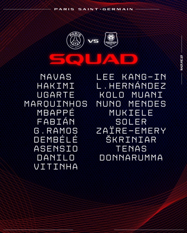 4月3日訊 北京時(shí)間明天凌晨,巴黎將在法國杯半決賽中對陣?yán)锥?。巴黎宣布了這場比賽的球員名單,由姆巴佩和登貝萊領(lǐng)銜,馬爾基尼奧斯回歸。